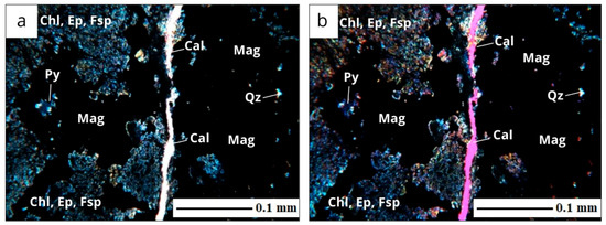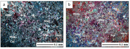 Calc–silicate rocks: (a) parallel nicols, (b) crossed nicols with compensator; magnification ×40. Conventional indices of minerals: magnetite (Mag); hematite (Hem); chlorite (Chl); epidote group minerals (Ep); calcite (Cal); serpentine (Srp).