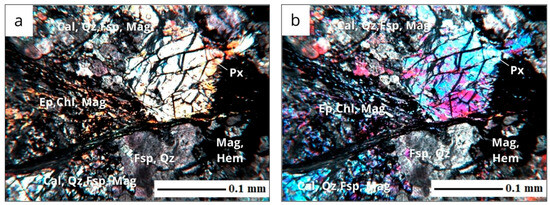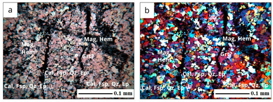 Cataclased carbonate–silicate rocks (magnetite skarns): (a) parallel nicols, (b) crossed nicols with compensator; magnification ×40. Conventional indices of minerals: calcite (Cal); feldspar (Fsp); quartz (Qz); epidote group minerals (Ep); chlorite (Chl); pyroxene (Px); magnetite (Mag); hematite (Hem).