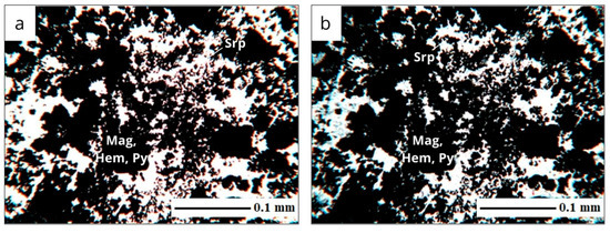 Ore zone of skarns: (a) parallel nicols, (b) crossed nicols with compensator; magnification ×40. Conventional indices of minerals: magnetite (Mag); hematite (Hem); pyrite (Py); serpentine (Srp).