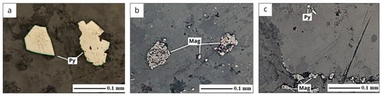 Inclusions of ore minerals in magnesian skarn, microphotographs of polished sections (a–c) with the analyzer switched on, direct light reflected in parallel nicols. Conventional indices of ore minerals: magnetite (Mag); pyrite (Py).