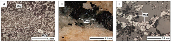Magnetite inclusions in skarns, microphotographs of polished sections (a,c) with the analyzer on, direct light reflected in parallel nicols; (b) with the analyzer on, direct light reflected in crossed nicols. Conventional indices of ore mineral: magnetite (Mag).