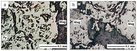 Magnetite inclusions in skarns of the outer zone, microphotographs of polished sections (a,b) with the analyzer turned on, direct light reflected in parallel nicols. Conventional indices of the ore mineral: magnetite (Mag); pyrite (Py).