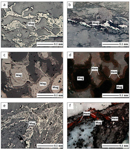 Magnetite and hematite inclusions in magnesian skarns, micrographs of polished sections (a,c,e) with the analyzer on, direct reflected light, in parallel nicols; (b,d,f) with the analyzer on, direct reflected light, in crossed nicols. Conventional indices of the ore minerals: magnetite (Mag), hematite (Hem).