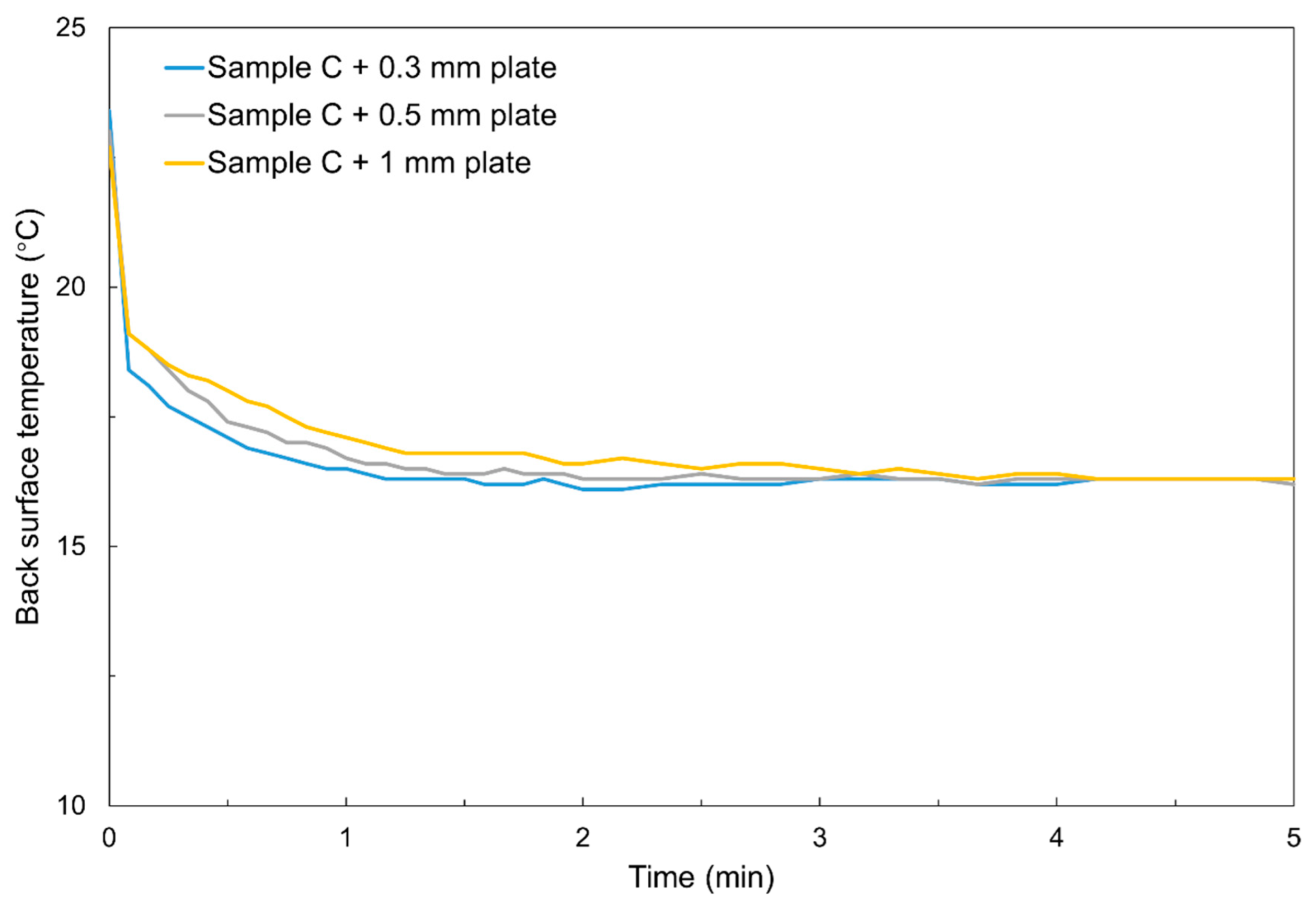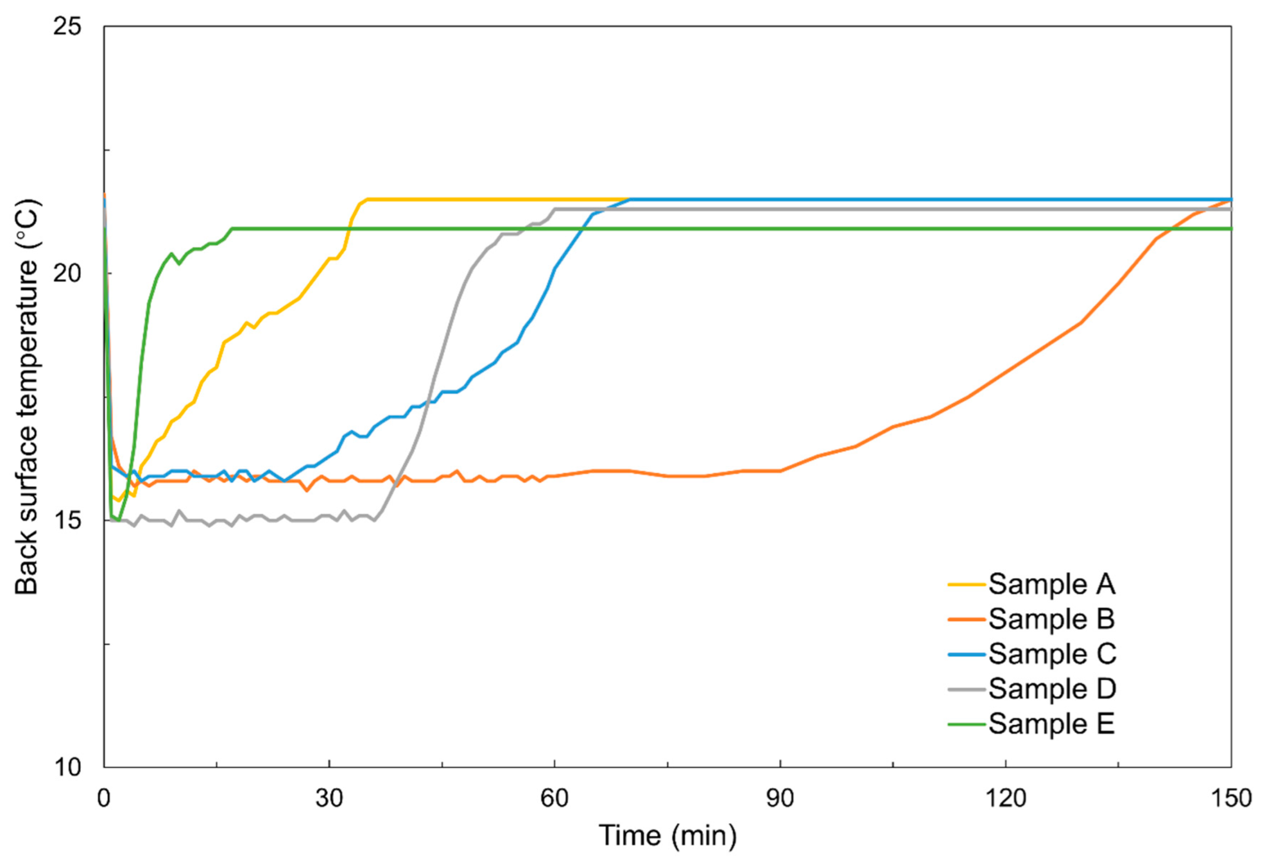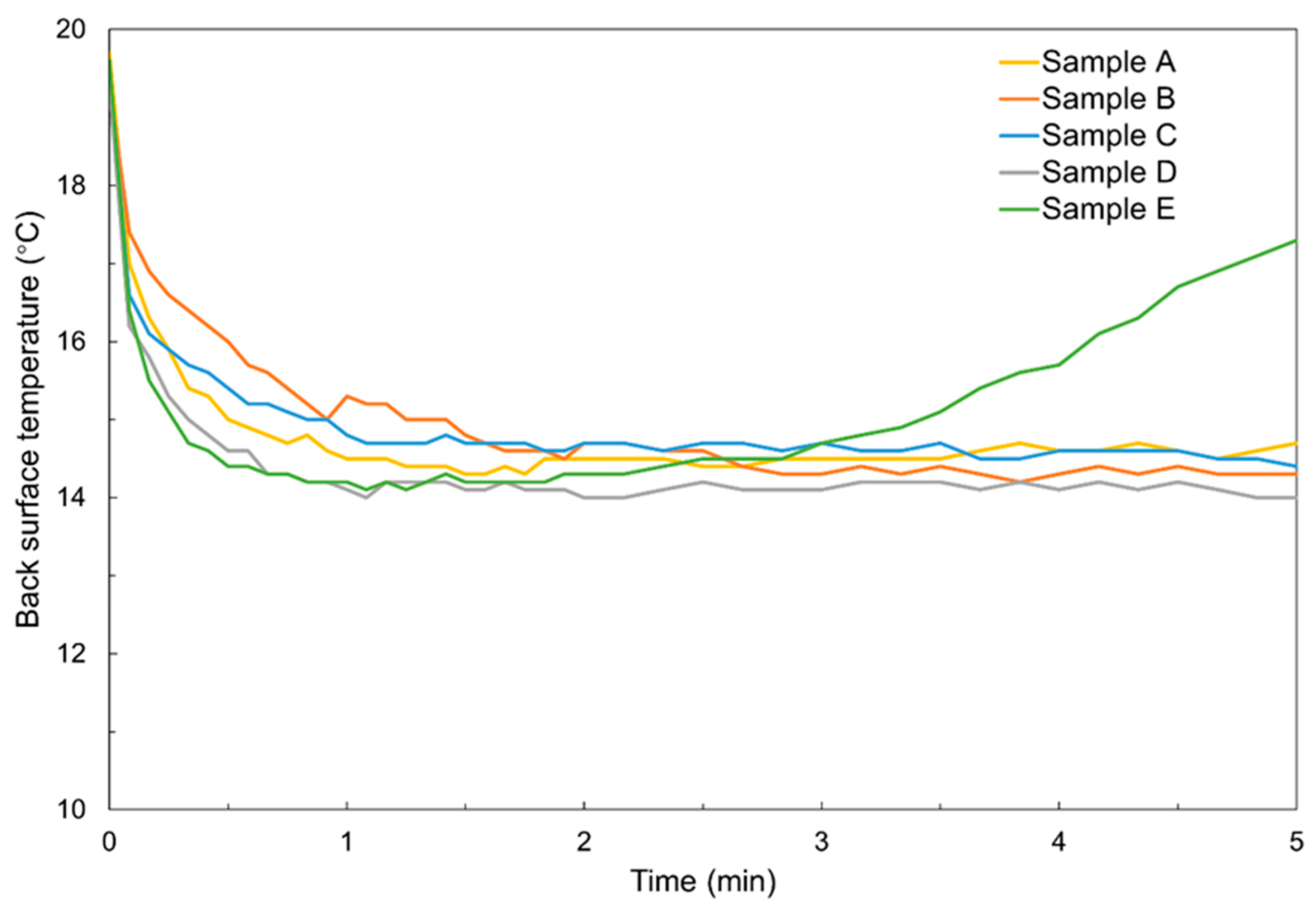 - The laser-resurfaced polymer (Sample E) demonstrated a fast thermal response and mechanical robustness due to its direct hydrophilic surface, eliminating reliance on supporting plates. However, its limited water retention curtailed the cooling duration, highlighting the need for further groove-structure optimisation to balance thermal efficiency and moisture storage.