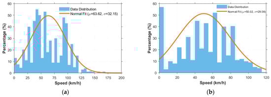(a) Speed distribution of vehicle A; (b) speed distribution of vehicle B.