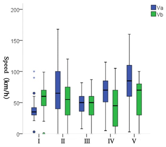 Type II and Type III scenarios both occur at intersections. The speed of vehicle A is greater at night without street lights than during the day (the traffic flow at the scenario at the time of the accident is less traffic, see Section 2.2), indicating that the number of lanes in the direction of travel and the steering condition of the vehicle have a large impact on the speed of the vehicle at the intersection.