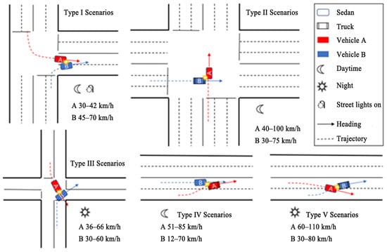 These five typical scenarios have no precipitation, good road conditions, and good visibility. The scenarios are illustrated in Figure 6. Note that Figure 6 only gives a schematic of the scenarios, and specifics such as collision location and collision angle need to be determined by further research.
