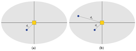 (a) The block grade is interpolated from a single sample at distance . (b) The block grade is interpolated using two samples at distances and . Although b contains more information and thus higher confidence, if resource classification relies solely on sample distance, a would be assigned greater confidence since is smaller than the average distance in b.