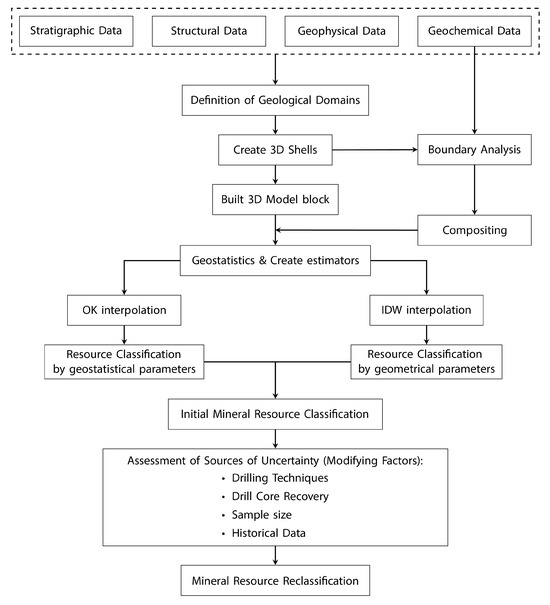 Numerous authors, e.g., [84,85], emphasize the need for a standardized workflow to develop robust geological models. Such a workflow enables efforts to be focused on well-defined tasks, ensures data consistency, and facilitates reproducible results by different users using the same input data and parameters. Figure 5 illustrates the proposed generalized workflow developed to incorporate the parameters analyzed in this section into the process of mineral resource reclassification. This framework provides a structured and systematic approach, facilitating the transparent integration of multiple criteria and enhancing the robustness, reproducibility, and traceability of the classification outcomes.