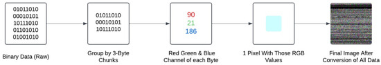 While the original bin2png script directly converted binary input into RGB images using the Python Imaging Library (PIL) [40], the modified version introduces an intermediate step to enable OpenCV resizing. The PIL image is first converted to an OpenCV-compatible format for resizing, after which it is converted back to the PIL to retain compatibility with the output specifications of the original implementation. The conversion approach processes each binary file as a continuous byte stream by mapping every three bytes to a single RGB pixel. Each byte ranging from 0 to 255 corresponds to one of the red, green, or blue channels. This encoded the binary structure of the file into colour-based representations. This visual encoding preserves the intrinsic features and layout of the binary data while enabling our model to extract spatial patterns and detect potential anomalies. A schematic overview of the image pre-processing workflow is provided in Figure 2.