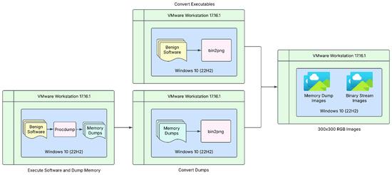 This criterion assumed that the process consuming the most memory was likely to represent the primary execution context and encompass the most relevant behavioural data of the application. To ensure environmental consistency and prevent cross-contamination during data acquisition, system snapshots were reverted after every 25 to 50 software installations. The final dataset comprised a total of 504 software samples, evenly divided into 252 benign programs. Each sample was subjected to both static and dynamic analysis procedures to yield two distinct but parallel datasets, each containing 504 image representations. All benign binary samples were transformed into RGB PNG images using bin2png_lanczos, which is an enhanced variant of the original bin2png script [38]. The primary enhancement in this version is the integration of an optional image resizing feature utilising OpenCV’s Lanczos interpolation. The generated images were rescaled to a uniform resolution of 300 × 300 pixels using the Lanczos resampling technique [39]. The Lanczos resampling technique was used to standardise the input dimensions across all samples.