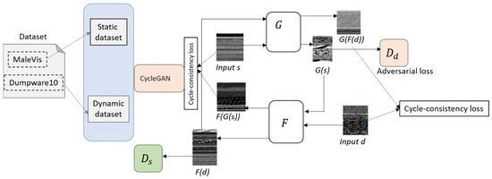 To enhance model generalisation in malware image classification, we constructed an enriched dataset using both conventional data augmentation and CycleGAN-based domain transformation, as illustrated in Figure 4. Let the original static image dataset be represented as , where are RGB image representations collected from the MaleVis dataset. Similarly, the dynamic dataset is denoted as , where each is derived from Dumpware10. To construct diverse variants of the original images, we define an augmentation transformation set , with each transformation function , to preserve the image quality while transforming the image spectral properties to be augmented.