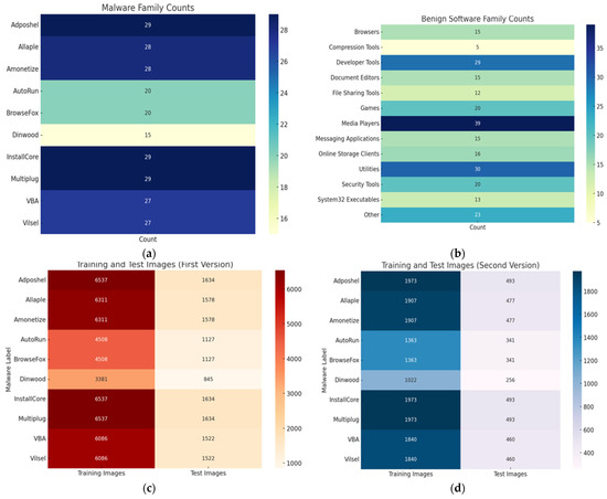 The heatmap presented in Figure 5a illustrates the distribution of various malware families utilised in the dataset. Each row corresponds to a malware variant, and the heatmap values denote the frequency count of each within the sample pool. The malware families installcore, Multiplug, and adposhel each had the highest occurrence count (n = 29), indicating a deliberate attempt to maintain a balanced distribution across predominant malware variants. This balanced approach is pivotal for ensuring that the convolutional neural network (CNN) model receives consistent exposure across diverse malware types during training, thereby reducing bias and enhancing generalisation. The relatively uniform distribution mitigates class imbalance problems, which are common in distorting classification accuracy in multi-class scenarios.