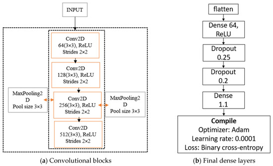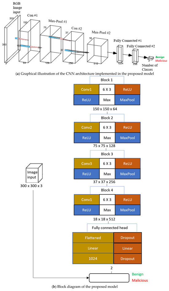 The proposed model is designed to process image representations of static and dynamic software behaviours for the purpose of binary classification to identify whether a given software instance is benign or malicious. The model was developed using a convolutional neural network. In the CNN architecture of the model, as illustrated in Figure 6a, the network begins by accepting a standardised augmented image input of size 300 × 300 × 3, representing RGB image data generated from either binary files or memory dumps. The uniform input size ensures consistency across the dataset, which comprises 74,080 augmented samples derived from 504 original software artefacts through brightness and noise transformations. A structural overview of the proposed CNN model is presented in Figure 6b.