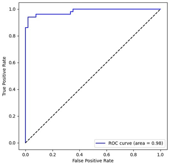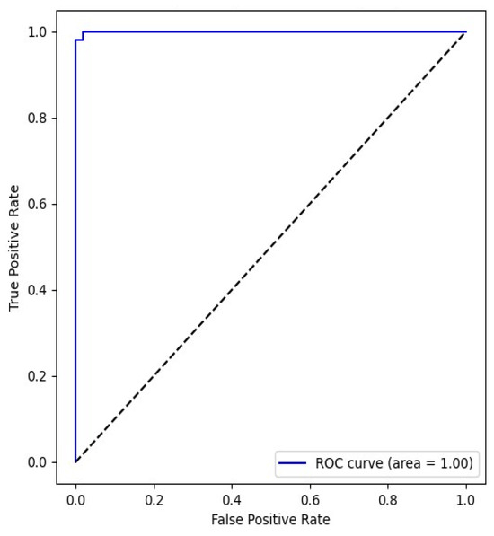 While accuracy remains high, the marginal reduction in recall for the Malicious class relative to the static model suggests a minor decline in the model’s sensitivity to certain malware variants. This degradation, though numerically small, is of particular concern in threat detection contexts, where even a few undetected malicious instances can have significant operational and security implications. The presence of false negatives in the dynamic environment may stem from temporal variability in runtime behaviour or insufficient generalisation over memory state features. The model has a high precision for the Malicious class, indicating a minimal false positive rate and strong reliability in positively identified threats. However, the precision achieved in the dynamic model is lower by 0.0157 compared to the static model. To further evaluate the discriminatory power of the proposed CNN model, a Receiver Operating Characteristic (ROC) analysis was conducted. The resulting Area Under the Curve (AUC) of 0.98 demonstrates near-optimal performance, indicating the model’s exceptional ability to distinguish between benign and malicious samples across varying classification thresholds, as illustrated in Figure 13.