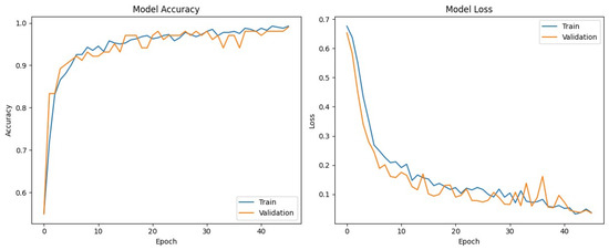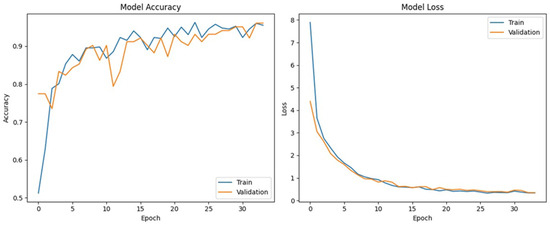 The ROC curve, which plots the True Positive Rate (TPR) against the False Positive Rate (FPR) at different decision thresholds, provides a threshold-independent assessment of classifier performance. The achieved AUC of 0.98 places the model within the excellent performance tier, signifying that it correctly ranks a randomly chosen malicious sample higher than a benign one 98% of the time. This high AUC value also complements previously reported metrics, such as recall, precision and F1-score, confirming that the model performs well not only at its fixed classification threshold but also across a range of possible operating points. This is particularly important in security-sensitive applications, where the optimal decision threshold may vary depending on operational constraints, such as prioritising low false negatives in high-risk deployments. Moreover, the convex shape of the ROC curve reflects consistent performance trade-offs between sensitivity and specificity, reinforcing the model’s robustness. The marginal deviation from a perfect AUC is most likely attributable to edge-case samples that exhibit behaviour or characteristics common to both benign and malicious classes. The training dynamics of the CNN model, as depicted in Figure 14, indicate consistent convergence across 34 epochs.