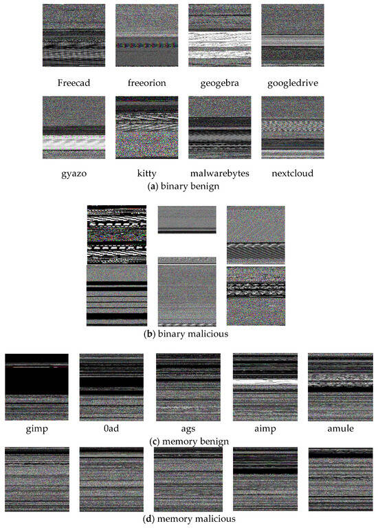 Figure 15c,d illustrate memory dump visualisations of benign and malicious software. The visual patterns provide a structural and behavioural contrast between legitimate applications and malware executing in memory. In Figure 15c, the memory visualisations of benign software reveal high intra-sample variability, yet share a common theme of structured horizontal bands, uniform textures, and clear segment separations. These characteristics suggest systematic memory allocation and modular execution flows, consistent with compiler optimisations and standard operating system routines for legitimate applications. For instance, gimp exhibits a large upper block of uniform black, possibly representing unused memory or zeroed regions, which is common in idle or GUI-intensive applications. These patterns reflect predictable and regulated runtime behaviour for stable benign execution fingerprints. On the other hand, Figure 15c presents more uniform, noisy, and dense textures across the image plane. This indicates highly packed or obfuscated memory regions, often resulting from runtime unpacking, self-modifying code, or the use of encryption. Also, a lack of modularity or segmentation compared to benign samples suggests non-standard memory access patterns and volatile behaviour common in advanced malware variants. The dense pixel streaks observed in some samples point to code injection, API hooking, shellcode execution, or memory scraping which overwrites or manipulates memory for exploitation.