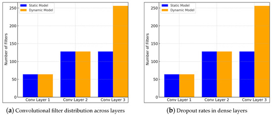 The experimental results revealed that although both models exhibited strong generalisation capabilities, the static CNN consistently outperformed its dynamic counterpart across all evaluation metrics. The architectural divergence is evident in Figure 16a, where the dynamic model significantly increases its convolutional filter count in the final layer. Meanwhile, Figure 16b shows the dynamic model also employs higher dropout rates, reflecting a more robust regularisation strategy.