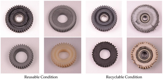 A remanufacturing expert conducted the data labeling process, based on the gears’ wear and tear, which varied depending on their usage in the electric bicycle motors and their inherent durability. Gears with partially or completely sheared gear teeth, deformed gear teeth, or broken gears were classified as recyclable, while gears without signs of wear and tear were classified as reusable, as shown in Figure 2. While some defects, such as completely sheared gear teeth, were easily identifiable, others, like deformed gear teeth, were not as easily detectable.