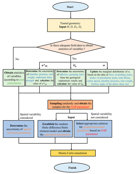 - Summarize the samples u*3D, ω and Gp, and, thus, obtain the samples of the GAP parameter. When inputting the GAP parameter in proper solution, the ground movement samples can be obtained. Then, the Monte Carlo strategy is adopted for the probability analysis.