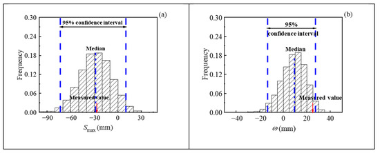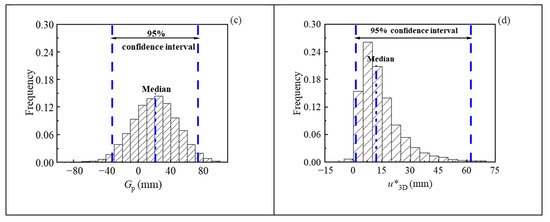 - Summarize the samples of the three components of the GAP parameter in the previous three steps, and then obtain the samples of the GAP parameter. Input the GAP parameter into the selected solution for ground movement. In this case, the selected solution is the analytical solution proposed by Loganathan and Poulos [18]. Obtain the displacement samples without considering the spatial variability, as shown in Figure 5. The statistical characteristics of u*3D, Gp and ω are shown in Table 2.