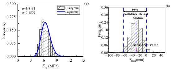 - Establish a finite difference/finite element model for the cross-section. Select appropriate autocorrelation function, probability distribution model and COV based on the spatial variability characteristics in the soil according to the statistics of soft soil collected by [31] and then carry out random finite difference/finite element analysis. Following the equivalent process, the equivalent parameters considering the spatial variability are obtained, and the probability analysis considering spatial variability can be carried out.