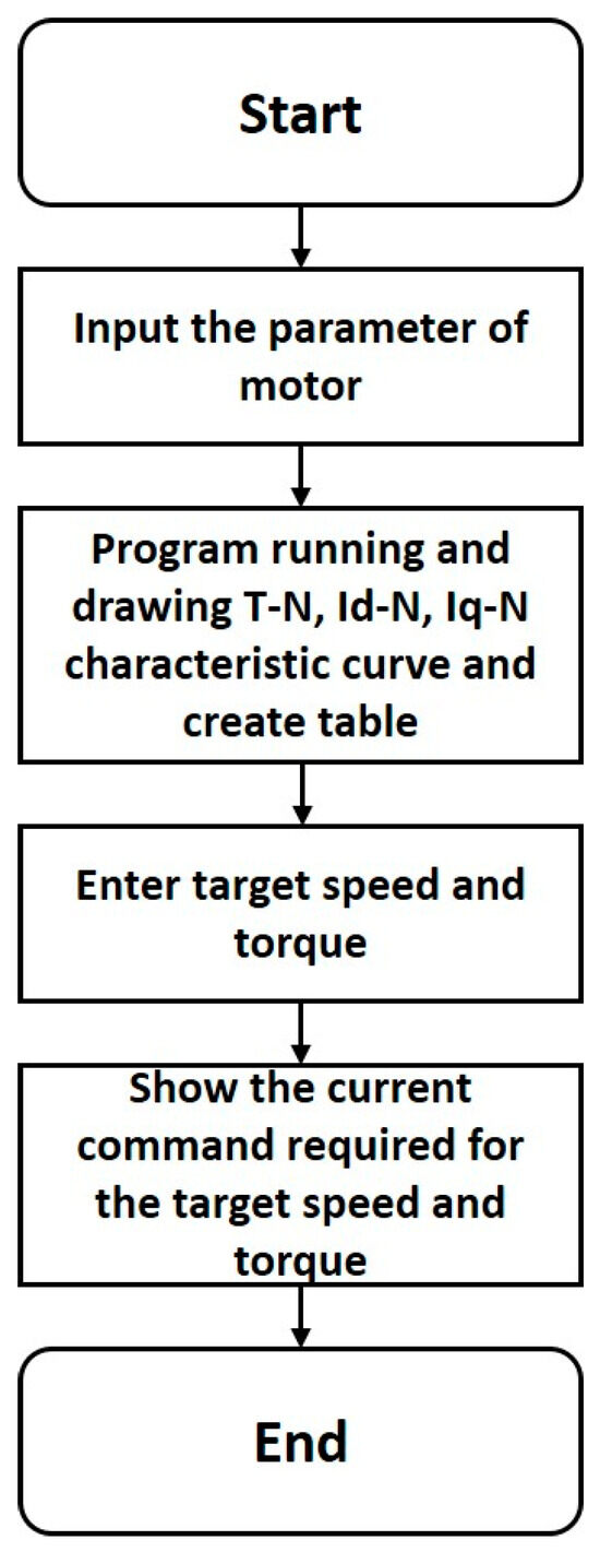 Users can directly save the current command data generated automatically by the system to create corresponding look-up tables. Using the look-up tables, users can quickly obtain the corresponding optimal d-q axis current combination based on any given torque and speed conditions to achieve real-time control command generation. Further, look-up tables can be exported as an xlsx file, which facilitates being implemented into an embedded motor controller. Figure 3 shows the dynamic look-up function of the table module in the tool page Tab2. Users can specify the operation points they want to inquire about through the input fields in the left block, including specific torque (N·m) and speed (rpm) conditions. Then, the system will perform interpolation calculations in real-time using the data tables created in Tab1, and display the corresponding d-axis and q-axis current command values in the right side output area. The detailed software flow chart is shown in Figure 4. The software logically judges which strategy will be used according to decided , , and . By decreasing the current magnitude with a specific current step, corresponding performance curves will be produced, and related data will be saved as look-up tables.