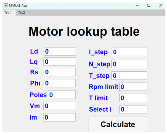 In Figure 2 (Tab1 page), the basic parameters of the motor and control conditions are divided into two columns, providing users with complete and flexible settings. The left column is the input area for the physical characteristics of the motor, where users need to input key parameters such as d-axis and q-axis inductances (, ), stator resistance (), permanent magnet flux linkage (), number of poles (), as well as maximum magnitude voltage () and maximum magnitude current (). The right column serves as the setting area for control calculation conditions, including current decrement step (I_step), speed increment step (N_step), torque increment step (T_step), maximum speed and maximum torque limits (rpm limit, T limit), and current display selection (select I), respectively.