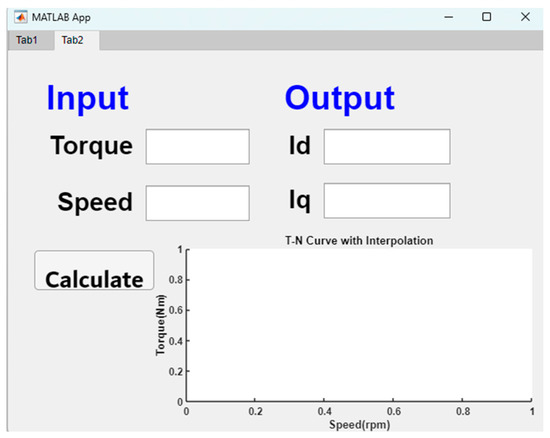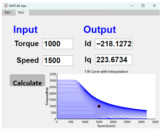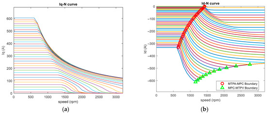 The system automatically calculates the d-q axis current distribution based on the motor parameters input by the user, combining the mathematical algorithms of the control strategies (MTPA, MPC, MTPV) established previously in Section 3.1, Section 3.2 and Section 3.3. It also plots the torque–speed (T-N) curves, d-axis current–speed (id-N) curves, and q-axis current–speed (iq-N) curves. Through this visualization, users can grasp the efficiency performance of the motor under various operating conditions, leading to a performance comparison and identification of the optimal efficiency region.