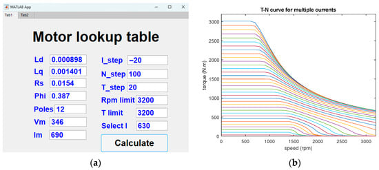Figure 5a shows the GUI with parameters input according to Table 1. Since the motor is a Y connection type, the peak magnitude voltage is . In addition, the current decrement step (I_step), speed increment step (N_step), and torque increment step (T_step) are set as −20 A, 100 rpm, and 20 N.m, respectively. Engineers can decide these steps by themselves according to their design requirements for sure. Note that the smaller the step is, the more curves there are. In other words, a large dimension of look-up tables will be exported as an xlsx file. The other inputs of rpm limit and T limit mean display ranges of speed and torque in the figures, which do not affect the calculation results.