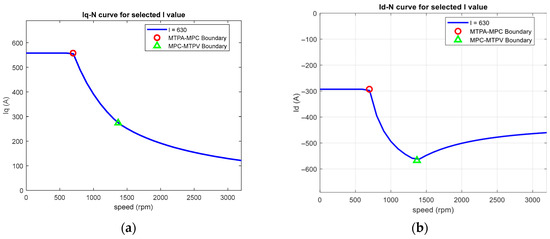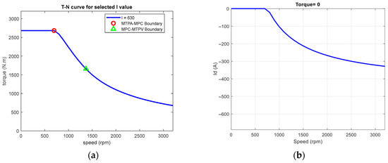 In order to enhance users’ understanding of the characteristics of control strategy switching, this system also provides a relationship diagram of q-axis current (iq) and speed (rpm) under the condition of a specific total current , as shown in Figure 7a. This diagram depicts the iq values required at different speeds when = 630 A, and clearly labels two points of key control strategy switching boundaries in the figure. Figure 7b illustrates the curve of d-axis current (id) versus speed (rpm) under a fixed magnitude current = 630 A. It can be observed that to meet the requirements for MTPV use, the magnitude current has to be greater than the magnetic flux linkage divided by the d-axis inductance value as ( = 424.28).