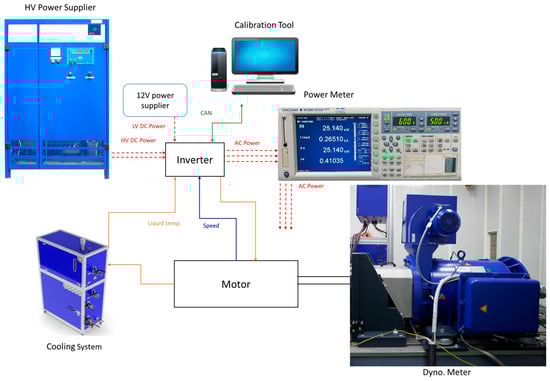 Figure 9 shows the experimental architecture, including a high-voltage power supplier, a low-voltage power supplier, a dynamometer, a power meter, a cooling system, and a calibration PC. The motor specification is shown in Table 1. The motor controller is based on a DSP TI TMS 570LS1114 core, and 1200V IGBTs are used for the inverter, which can provide 800 A peak current. The DC voltage is set as 600 V. A calibration tool PC can input id-iq current commands by CAN communication to the motor control, and perform a closed-loop current control in the DSP. By using optimal current id-iq command tables, which are automatically generated according to the settings shown in Table 1, the tables have been used in the DSP to test the motor performance.