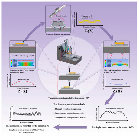 On-machine measurement is widely used in various machining fields such as milling [1], grinding [2], and cutting [3]. However, the application of on-machine measurement is significantly constrained by the inherent accuracy limitations of precision machine tools. On-machine measurement accuracy can be effectively improved through straightness error compensation. Ordinary precision machine tools use linear guideways as motion axes. The straightness error of the linear guideway is determined by the manufacturing accuracy of the mounting base and the guideway [4,5]. Straightness can be improved by adjusting the preload screw and manually grinding the mounting surface, but these methods are costly and limited in improving accuracy. Compared to alternative approaches, error compensation techniques demonstrate significant effectiveness in enhancing linear guideway straightness accuracy.