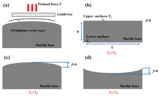 Linear guideway straightness error can be divided into low-frequency straightness error z1(x) and high-frequency straightness error z2(x). Low-frequency straightness error is mainly caused by clamping deformation. As shown in Figure 2a, the low-frequency straightness error is determined by the bottom surface of the guideway and the upper surface of the marble base together under preload F. However, the temperature difference between the upper and lower surfaces of the marble base is generated due to ambient temperature, friction, and other factors [32]. Since the ambient temperature of the machine tool fluctuates greatly, it is necessary to analyze the effect of temperature difference on the straightness error. As shown in Figure 2c, when the upper surface temperature is higher than the lower surface temperature, the marble surface is raised. As shown in Figure 2d, when the upper surface temperature is lower than the lower surface temperature, the marble surface will be concave [33]. Assuming that the temperature difference between the upper and lower surfaces of the marble base is ΔT, the maximum bending error of the marble surface is linearly related to the temperature difference, which can be expressed as Equation (2):