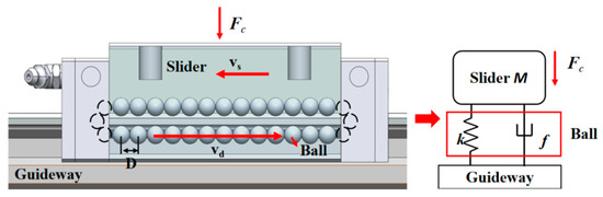 The linear guideway will produce a fixed cycle of vibration; the vibration is mainly due to the cyclic movement of the ball [31], as shown in Figure 4. Assuming that the raceway is completely filled by the ball, there is no gap between adjacent balls, and the balls do pure rolling in the raceway. The slider moves at a constant speed, vc, relative to the fixed rail, then the relative speed, vs, of the center of the balls relative to the slider is vc/2. The balls move in and out of the raceway, generating a cyclic vibration. The vibration time period, T, can be calculated from moving speed, vc, as shown in Equation (3). The time period, T, is converted into a vibration displacement period, Tx, as shown in Equation (4):