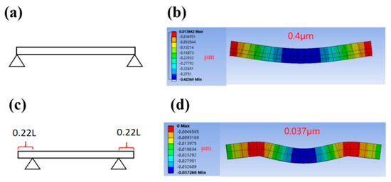 Linear guideway gravitational deformation. (a) Two-sided support. (b) Gravity deformation of two-sided support. (c) Bessel point support. (d) Gravity deformation of Bessel point support.