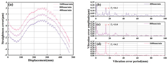 Vibration error period test results at different speeds. (a) Straightness error at different speeds. (b) Spectrum diagram at a speed of 400 mm/min. (c) Spectrum diagram at a speed of 800 mm/min. (d) Spectrum diagram at a speed of 1600 mm/min.