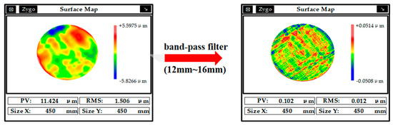 Next, experiments were conducted to verify the linear guideway straightness error separation and compensation of the accuracy limit after controlling the above factors. Each set of data was measured three times, and the average value was taken. The temperature difference could be controlled by real-time temperature monitoring. The vibration error could be controlled by band-stop filtering, and the gravity deformation of the straightedge could be controlled by optimizing the clamping method. As shown in Figure 10, the straightness error was compensated; the straightness error before compensation was about 4.2 μm, and the straightness error after compensation was 0.22 μm. It should be noted that filtering does not really eliminate vibration errors. However, when the machine is used for on-machine measurement, the 12 mm to 16 mm cycle error is sometimes not taken into consideration. Then, the vibration error in this frequency band can be eliminated by using a band-stop filter. The study revealed that the peak-to-valley (PV) value of surface error in the 12–16 mm spatial wavelength range after grinding is 0.1 μm, which is significantly smaller than the total surface error (PV 11.4 μm), as shown in Figure 11. The result shows that the error in the 12~16 mm frequency band can be neglected during on-machine measurements of grinding workpieces. To avoid image distortion caused by filtering, this paper eliminated the vibration error by using the FFT filtering method. The band-stop filter band was set to 12~16 mm, and the straightness error could be reduced to 0.16 μm after band-stop filtering.