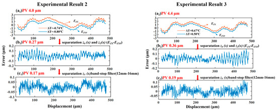 The effect of straightness error compensation under different temperature gradients was further tested. As shown in Figure 12, the straightness error is reduced from PV 4.0 μm to 0.17 μm after compensation in Experiment 2 and from PV 4.4 μm to PV 0.19 μm in Experiment 3. Overall, the straightness error of the machine tool can be reduced by 95% by controlling the factors of temperature and vibration, and the straightness error is better than 0.2 μm after compensation.