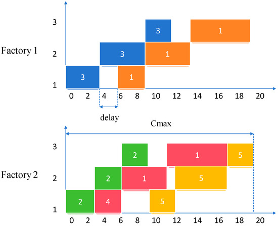 Example Gantt chart of the DNWFSP illustrating the no-wait constraint. Jobs are scheduled across two factories, with each rectangle representing an operation. The horizontal axis denotes processing time; the vertical axis denotes machines.