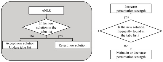To avoid redundant or ineffective perturbations, a hash-based tabu list is introduced to track recently visited solutions. Each solution is hashed for fast lookup and stored in a fixed-length tabu list. If a newly generated solution is frequently found in the tabu list, then the ATP will adaptively intensify the perturbation to explore more diverse solution regions. Conversely, if few tabu hits occur, then the perturbation intensity is reduced to save computational cost. The adaptation is controlled by the parameter r ∈ (0, 1], where r simultaneously determines the number of perturbation attempts and the maximum swap size in ATP. After each iteration, r is updated based on the tabu hit rate as follows:
