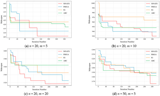 To further evaluate the convergence behavior of the proposed MNATS algorithm, convergence curves of MNATS and the other three comparative algorithms were plotted for datasets of different sizes. In each experiment, the makespan value found by each algorithm was recorded at each iteration, and the results are shown in Figure 5.