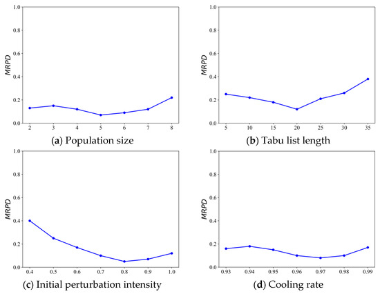In summary, MNATS achieves its best performance when the population size is set to 5, the tabu list length is set to 20, the initial perturbation intensity is set to 0.8, and the cooling rate is set to 0.97. Moreover, the results remain stable within small neighborhoods of these settings, confirming that MNATS is robust to moderate parameter changes and that the chosen defaults lie in a near-optimal region.