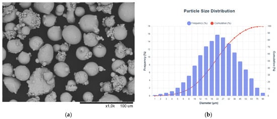 Particle size distribution was determined using laser diffraction spectroscopy ((LA-950V2, Horiba Scientific, Kyoto, Japan)) following the ISO 13320:2020 standard []. The refractive index was set to 1.65 for the NiCrFe alloy.