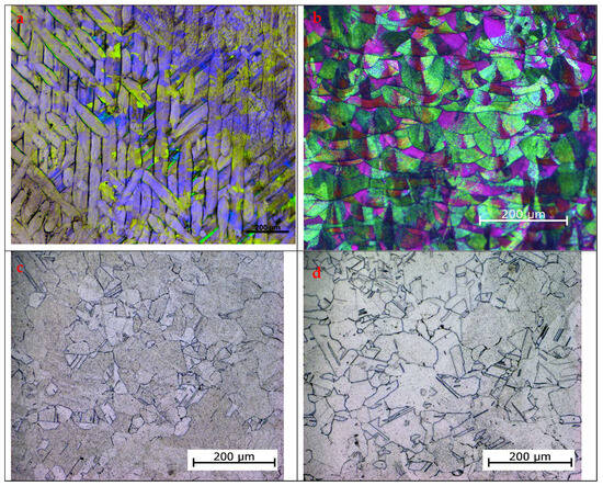 Microstructure of Hastelloy X alloy after LPBF under polarized light: (a) in the XY plane; (b) in the XZ plane and subsequent HIP treatment, observed under white light; (c) section parallel to the XY plane; and (d) section parallel to the XZ plane.