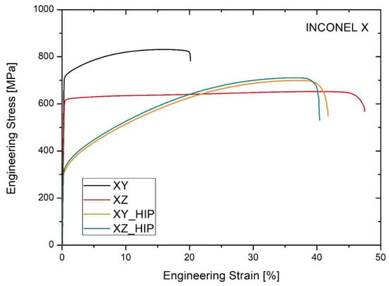 The tensile test results presented in Figure 5 and Table 4 provide conclusive evidence of the significant influence of build orientation and Hot Isostatic Pressing (HIP) post-processing on the mechanical properties of Hastelloy X alloy fabricated via Laser Powder Bed Fusion (LPBF). As-built LPBF specimens exhibited pronounced mechanical anisotropy, directly attributable to the layer-by-layer manufacturing process, where specimens built in the XY orientation demonstrated superior strength characteristics with yield strength (YS) reaching 682 MPa and an ultimate tensile strength (UTS) of 864 MPa, albeit with limited ductility (17% elongation to failure). Conversely, XZ-oriented specimens showed substantially reduced strength properties (YS = 621 MPa, UTS = 653 MPa) but exhibited very high ductility with elongation reaching 47%, reflecting the influence of inter-layer boundaries and columnar grain structure orientation relative to the loading direction. A direct comparison of elongation at break for XZ and XZ after HIP is not appropriate due to the completely different behavior of these two materials. Based on the curve for XZ, we can conclude that the material has no strengthening (or weakening) effect during the tensile test, which is uncommon. In the case of the HIP-treated material, we see a clear strengthening of the material during the tensile test until the tensile strength is reached. Once this is reached, there is a clear localization of deformation in the form of a neck and effective breakage of the sample. A typical strengthening effect is a reduction in the plasticity of the material, and a decrease in plasticity, defined as elongation to failure, from 47% to 38% speaks very well for the properties of the material after the HIP process.