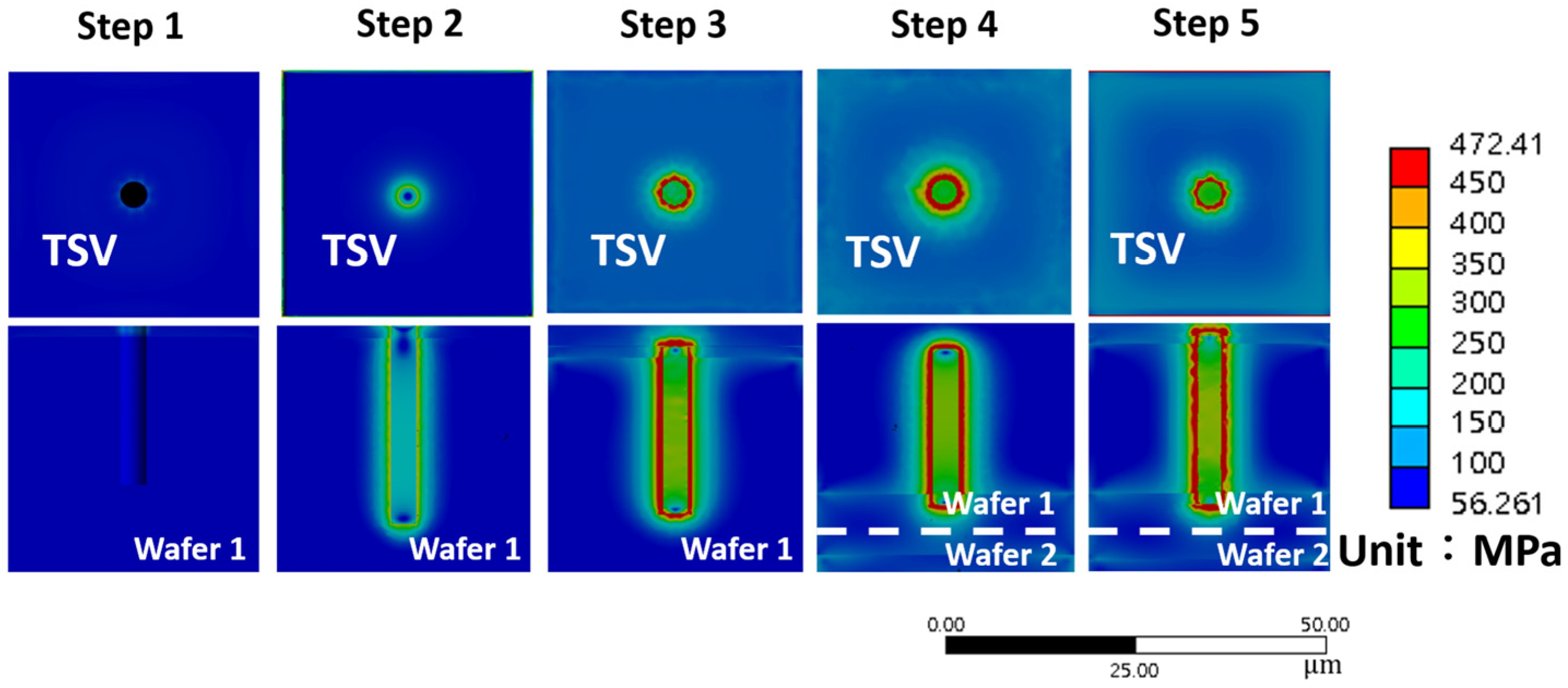 2. In Steps 4 and 5, after the oxide bonding of two wafers and the completion of the back-side RDL process, the stress distribution remains concentrated around the TSV edges. These results confirm that the TSV perimeter is consistently the most vulnerable region to stress accumulation throughout the entire process flow. The analysis clearly indicates that the operating temperature at each process step is the primary factor influencing stress behavior in the system.