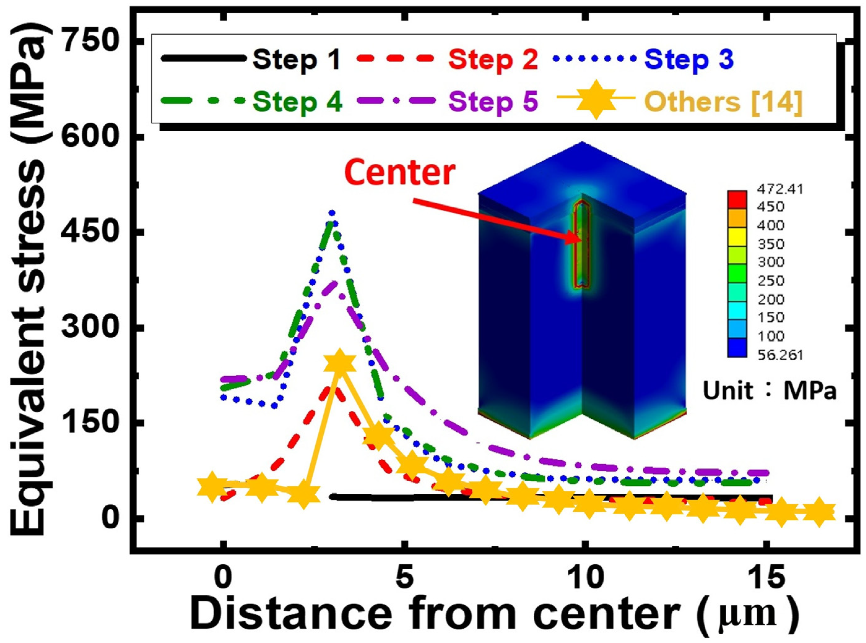 14], validating the accuracy of our simulation model. As the process progresses, the stress increases significantly. The yield strength of Si is approximately 165 MPa, and using a safety factor of 1.5, we define the critical stress threshold for the keep-out zone (KOZ) as 110 MPa. The stress peaks at the TSV edge, located about 3 μm from the center, and gradually decreases with distance. The stress falls below the KOZ threshold at a distance of approximately 7.5 μm from the TSV center. Therefore, the KOZ radius in this model is determined to be 7.5 μm, which is 1.5 times the TSV diameter. In