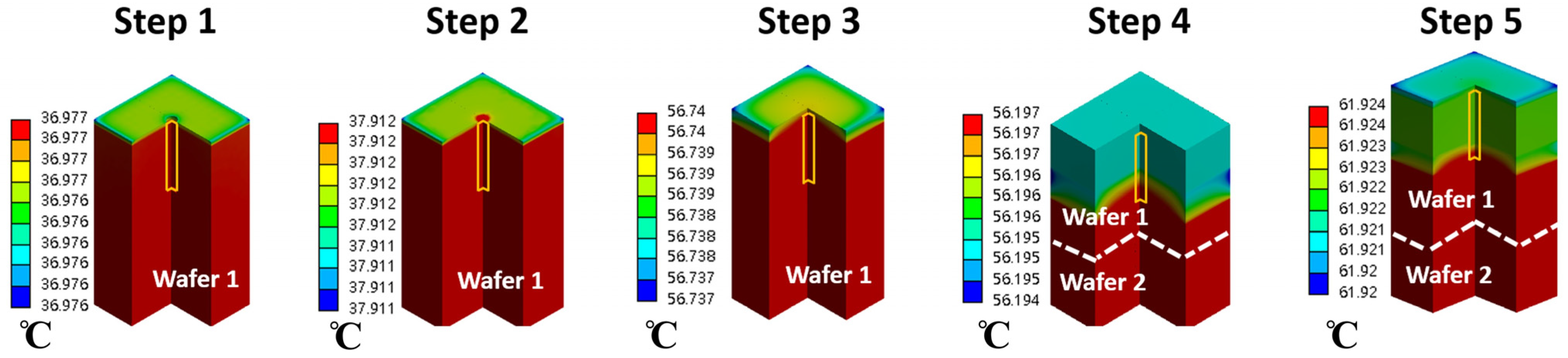 In the transient thermal model, the bottom surface of the silicon substrate is treated as a perfect thermal insulator to emulate conditions where the wafer is temporarily suspended or minimally coupled to a heat sink, such as during bonding or annealing steps. A uniform convective heat transfer coefficient is applied to all exposed surfaces to approximate free convection in ambient air. While this simplification facilitates comparative analysis across process steps, we acknowledge its influence on cooling dynamics and note that future work will explore more process-specific thermal boundary conditions.