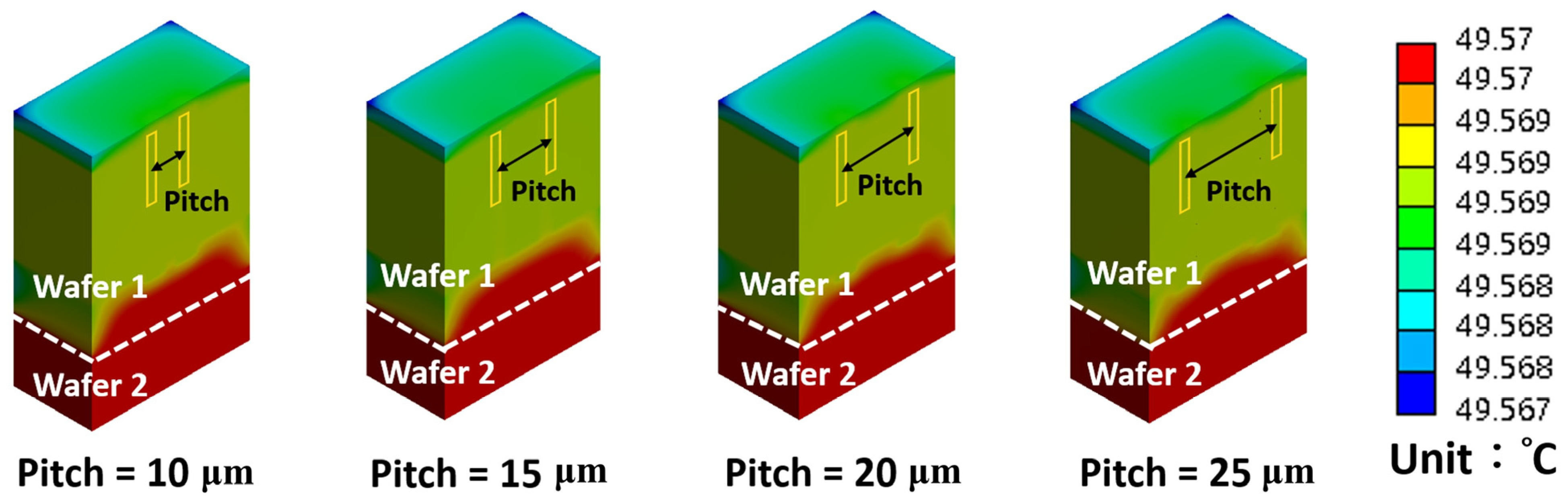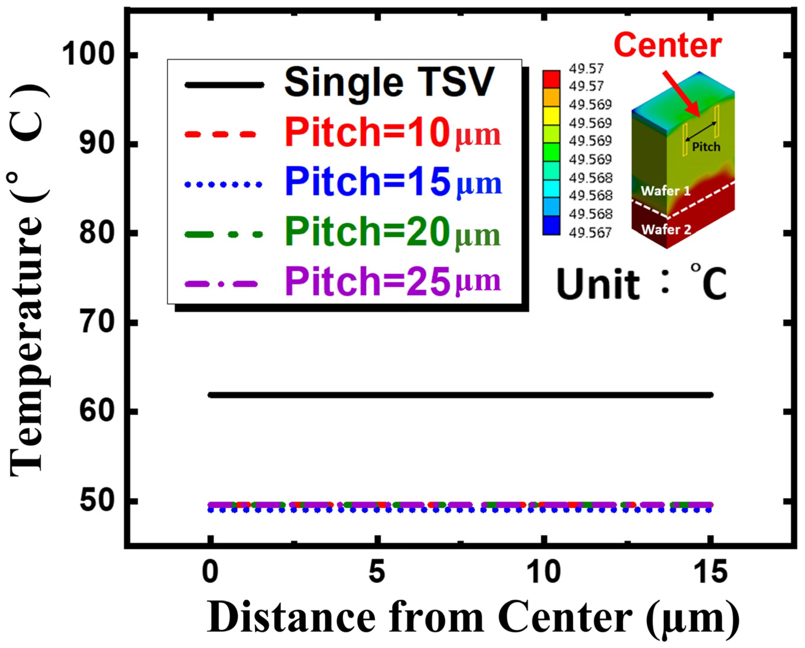 To further investigate the thermal behavior in multi-TSV configurations, we simulated temperature distributions for TSV pairs with varying pitch distances ranging from 10 μm to 25 μm.